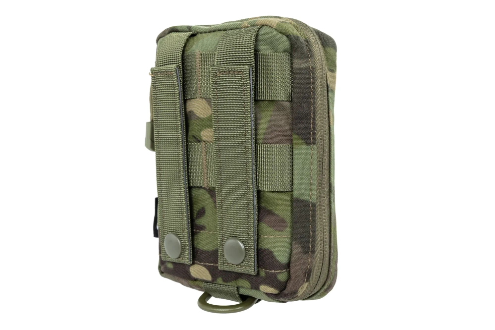 Specna Arms Tactical kleine EHBO-koffer van duurzaam CORUND™ 500D, gesloten met een tweepolig slot dat helemaal opengaat voor gemakkelijke toegang. Het interieur is voorzien van elastische singels en bindkoorden voor eenvoudige organisatie van getransporteerde medische uitrusting. Het model heeft een MOLLE-compatibele bevestiging, waardoor het product kan worden bevestigd aan vesten, riemen of rugzakken. Voor een betere identificatie is de voorkant voorzien van een medische markering. Bovendien vind je aan de voorkant ook een keelpaneel waarmee je extra patches of badges kunt bevestigen.